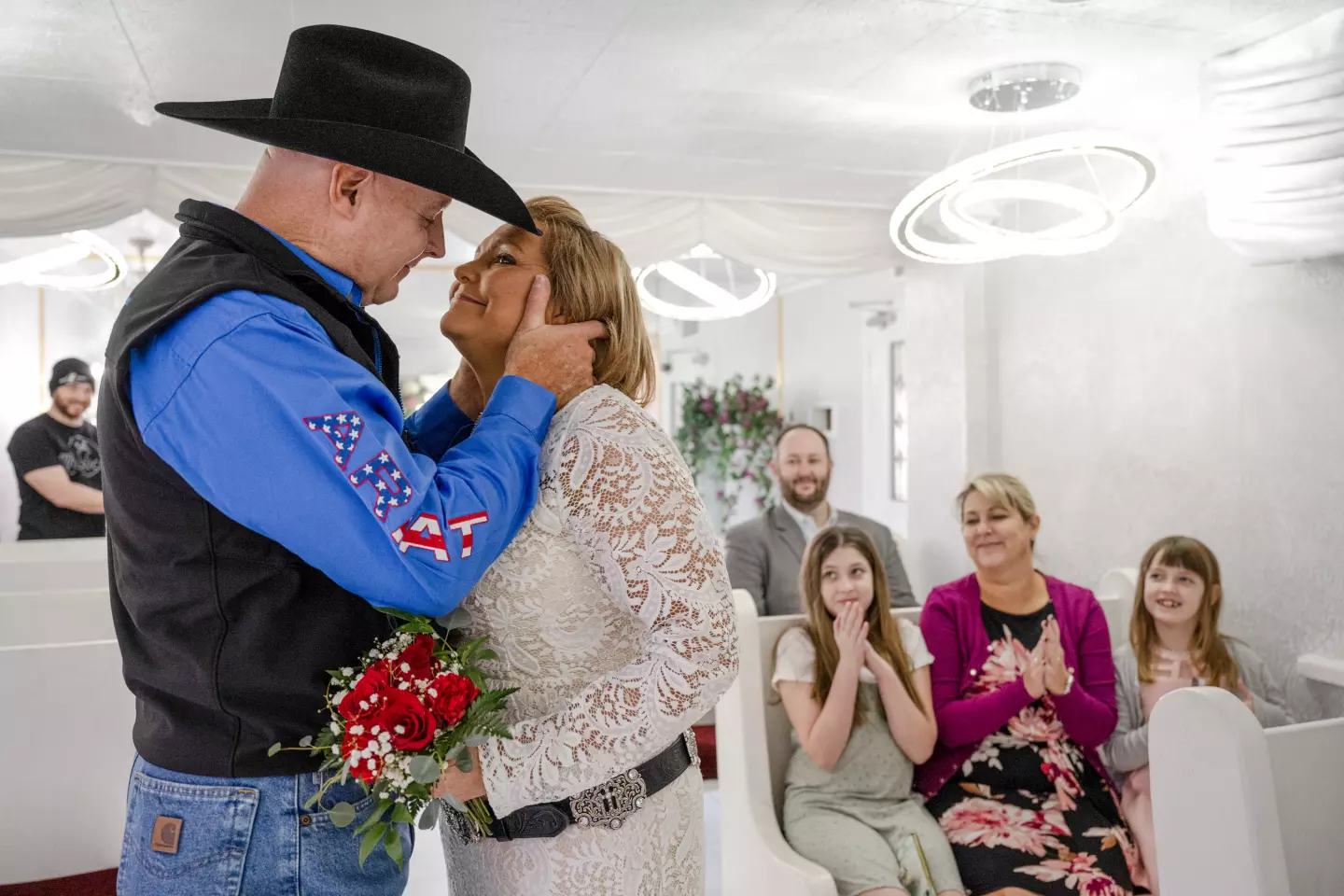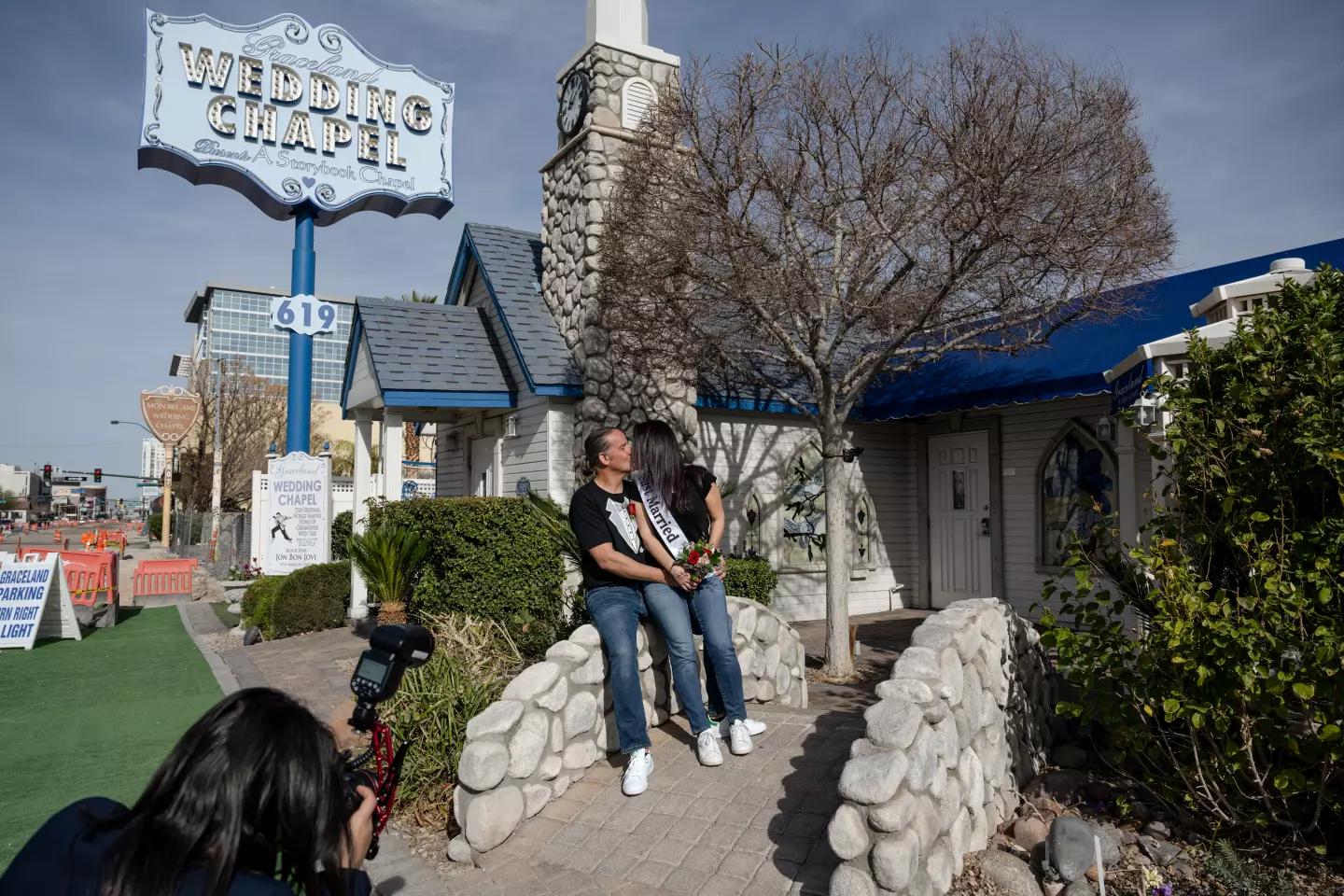 Dozens of wedding chapels were open for business Monday. Melissa and Jason Dowe brought their two Yorkshire Terriers, Minni and Harley, to renew their vows at Vegas Weddings, in downtown Las Vegas. The two were truck drivers who shared their first kiss in 2014.
