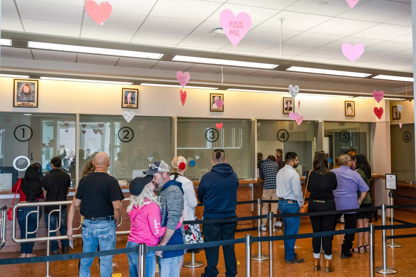 On Valentine’s Day morning, the bureau was bustling with soon-to-be-married couples. They were dressed in jeans and dresses, embracing and sharing kisses as they waited in line to purchase marriage licenses — the document that would render their union legally valid — for $102. Some days, the line is hundreds of feet long, wrapping around the block, said County Clerk Lynn Marie Goya, who oversees the bureau.
